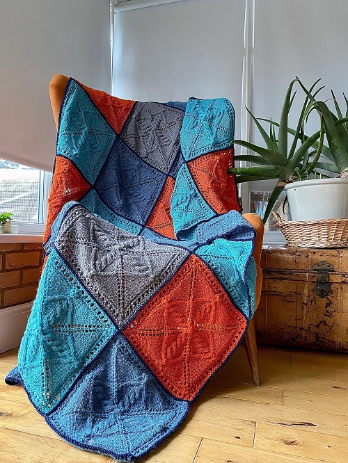 This cabled patchwork afghan cum blanket by LooseLoop is worked in square motifs, making it a great pattern for knitting on the go. You can mix and match your favourite colours and choose a different yarn to create a beautiful colour palette that complements your decor!