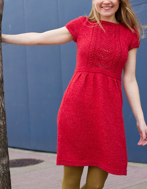 Wear this stunning red dress for your next date on Valentine’s Day by Pamela Wynne. The knitting gauge for this pattern is 20 stitches and 26 rows = 4″ in stocking stitch on a US 6 and 5 circular needle.