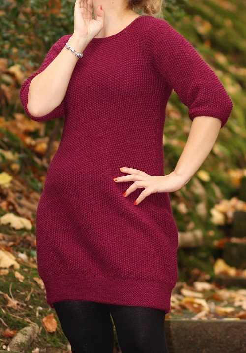 Anna Kuduja has made a dress or sweater with a simple top-down construction in fingering-weight yarn, using US 5 knitting needles. This stitch pattern is a simple alteration of knit and purl stitches and can be easily modified.