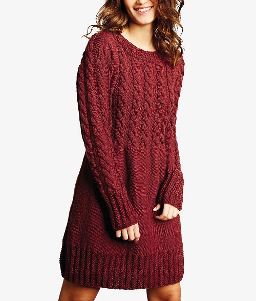 A little bib front dress for an enchanting winter by Bergere is soft and comfy. You’ll like how the slimming, close-fitting top flares out to finish just above the knee. The stitches used are fancy rib, stocking stitch, reverse stocking stitch, and cable stitch.