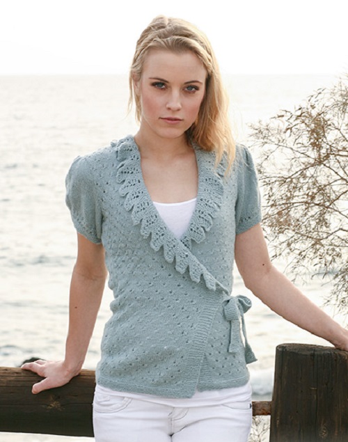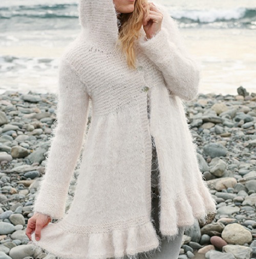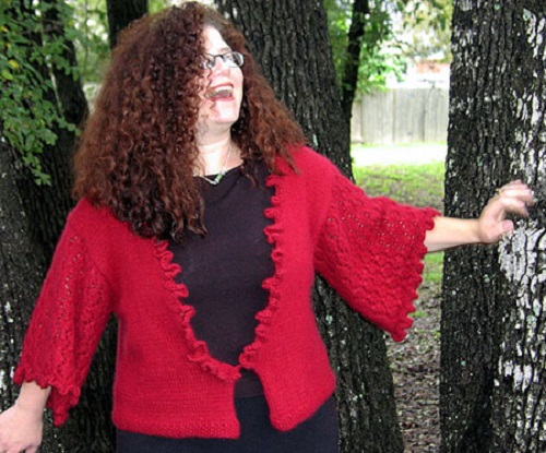 Ruffle, bell sleeves, lace, and angora are a great girly-girl get-up by Jillian Moreno. Start now to get a little romance just in time for Valentine’s Day. This pattern is available in sizes M, L, XL, and XXL.