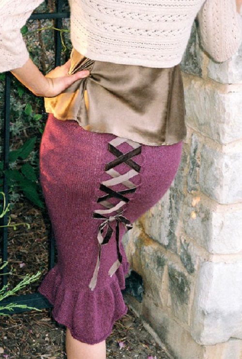 Ashley Monchrief has created a charming purple skirt suited for fall. The knitted fabric drapes closely over the figure, enhancing the style of this coy little skirt. This pattern is simple with the corset panel in black (the only tricky part).