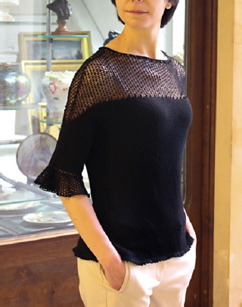 Hobbii has provided an elegant tee, worked flat, beginning at a provisional cast-on at the center front and working to the right side body seam. Each sleeve is worked in the round from live stitches at the armhole to the lower edge of the sleeve.