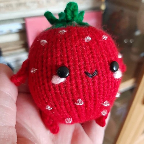 A cute character-style strawberry with personality is designed by Anjé Esterhuizen. It feels lively and expressive, making it great for gifts, and is made using aran-weight yarn and US 2½ knitting needles.