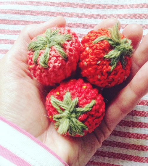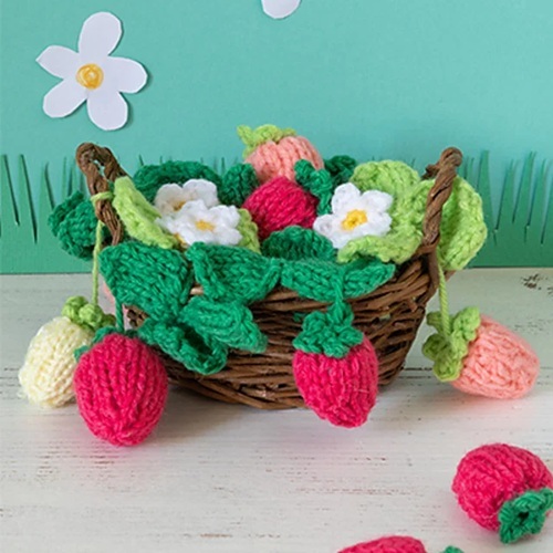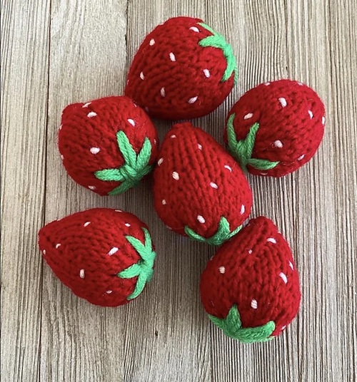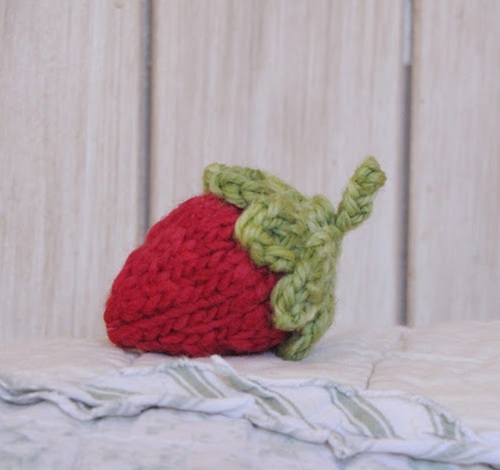 A set of soft strawberries that can be made in multiples is available at the Clickety Sticks blog. It is knitted from the bottom up and seamed, which is quick to knit and ideal for filling bowls or baskets.