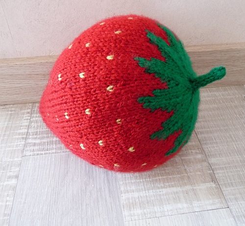 Patty IJzermans has created this giant strawberry stuffed toy, which is worked using US 2½, 3, 4, and 5 knitting needles. It includes stranded colorwork, and the light green dots can be added by darning.