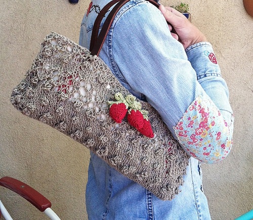 This design by Sweater Girls Knit turns strawberries into a fun and functional bag. The knitting gauge is 16 stitches and 20 rows = 10 cm. It is inspired by a vintage 1960s purse.