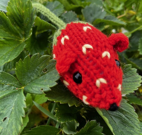 A creative mix of a strawberry and a tiny mouse is published by Juanamac On. It has a whimsical feel and makes a charming little toy. The nose point is cast on, and the tail is knit as an i-cord as part of the body.
