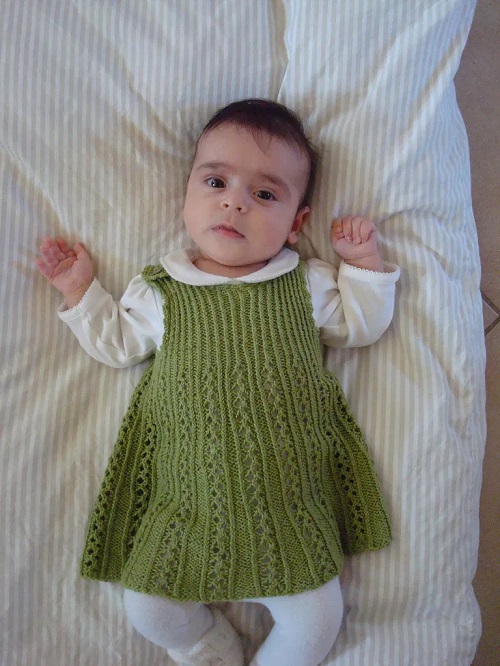 Wouldn’t you like to dress up your baby girl in eye-catching colors, like this one by ppistachio, which resembles a lace design? But it is a knitted pattern along with bloomers.