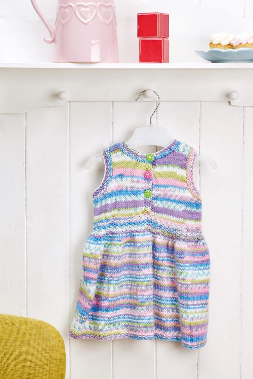 The dress by Cygnet Yarns features colorful stripes, making it more cheerful. Make them wear at your kid’s friend’s birthday or at any occasion. The colorful buttons are the dress’s charm.