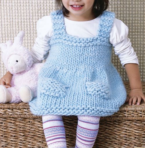 A beautiful pastel-blue dress from Vogue Knitting features two pockets that let your kids sneak a peek at some candy. The knitting gauge is 8 stiches and 12 rounds = 4″ over stocking stitch using size 17 needles.