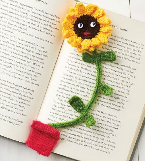 Have a look at this lovely sunflower bookmark by Louise Smith. It is a simple and useful project that adds a cheerful vibe to your reading time. The bookmark features a small knitted flower at the top, and the cute facial expression makes it a must-have.