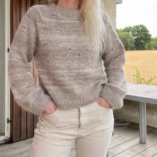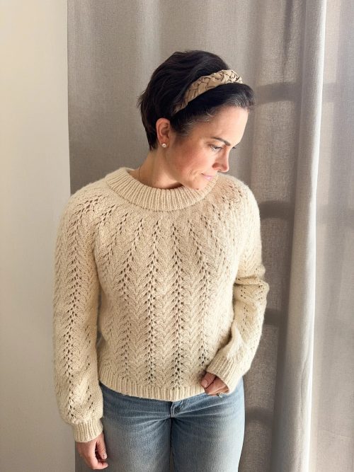 Doesn’t it look like the intricate patterns of salt flakes? Veronika Lindberg has created a sweater that gives a unique and delicate look. The extra-long sleeves add the drama. It is worked on US 8 and 2.25 needles and DK weight yarn.