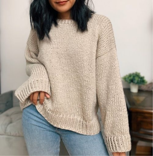 If you are looking for a no-sewing knit pattern, this loose sweater by Knictro Addict comes with an easy-to-follow video tutorial and step-by-step instructions. It is available in women’s sizes XS-XXL. Knit a top-down sweater together.