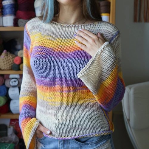 A lightweight and colourful cotton sweater by Bloodi Mary Art is worked with a circular knitting machine. The colours of this sweater will go perfectly with the spring flowers, and you could even use it for layering in cold weather.