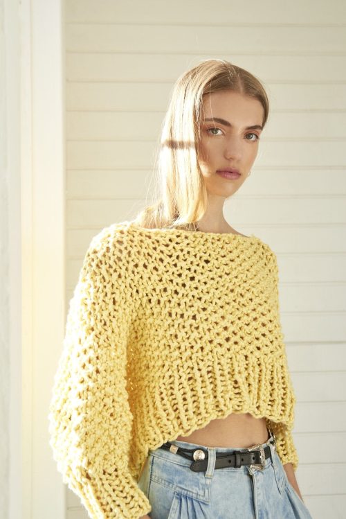 Create this chunky, cropped, fancy cotton sweater for your beach outings. Layer it over the tank top and pair it with your jeans or midi. It is available on The Likeevs.