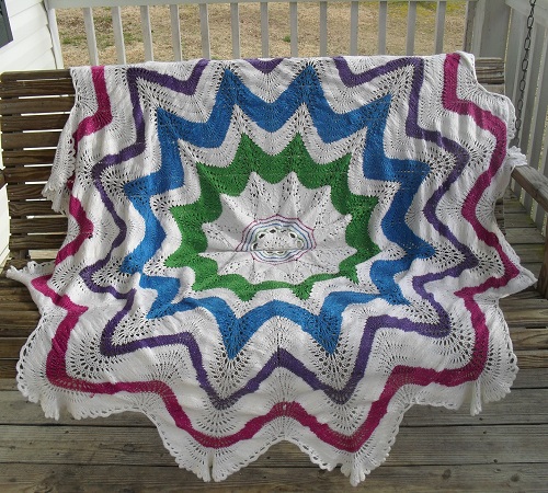 The tablecloth adapted by Mary R. White is worked in worsted-weight yarn and US 8 knitting needles. The colors added to the white make it attractive. You can even try it in different colors.