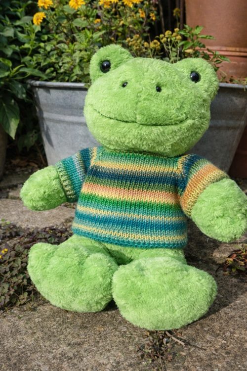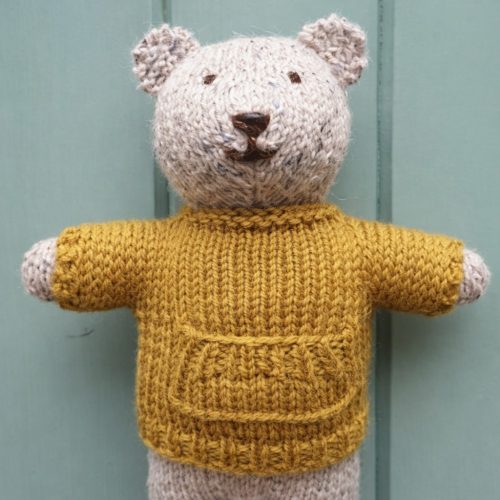 A striped sweater by Myrthe van der Tier is perfect for a medium-sized teddy bear. It is knitted with DK yarn and 5 mm double-pointed needles. You can complete this project while completing your favorite series.