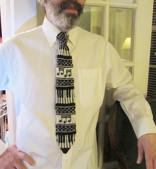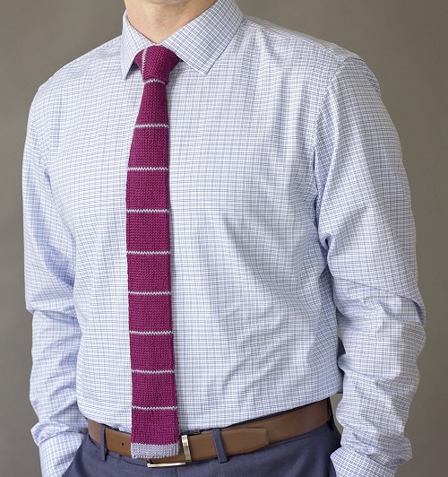 This diagonal necktie pattern by Free Vintage Knittage has a clean slanted line. The tie is knitted in one flat piece, which is then folded, and the edges sewn together up the back. It’s easy to match with most shirts and works well for both casual and dressy outfits.