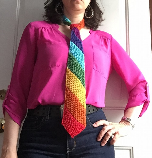 Add a splash of color to your daily outfit with this colorful stripe tie pattern by Suzanne Resaul. The stripes create a fun and eye-catching look to your wardrobe. Plus, you only need worsted yarn and a 6-4.0 mm needle for moss/seed stitch.