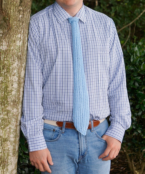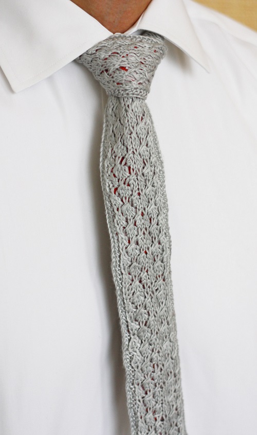 Deborah Tomasello is behind this fantastic diamond swirl tie. It has a classic look with a subtle pattern that adds detail, and the diamond swirl gives it a more elegant yet bold look. The pattern works up fast and is simple to work.
