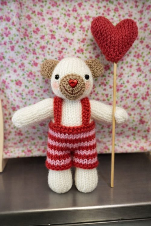 A teddy in a striped outfit with a heart is a perfect gift for Teddy Day during Valentine’s Week. L.T. Marshall has knitted this flat on two needles using acrylic wool and US 3 knitting needles.