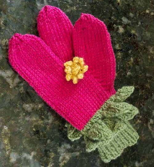 Megan Lane has knitted this cute tulip mitten with the knitting gauge of 6 stitches and 9 rows = 2.5 cm in stockinette stitch. The surprise in these mittens is at the center when the flower is opened; i.e., the hand, you can see the yellow pistil.
