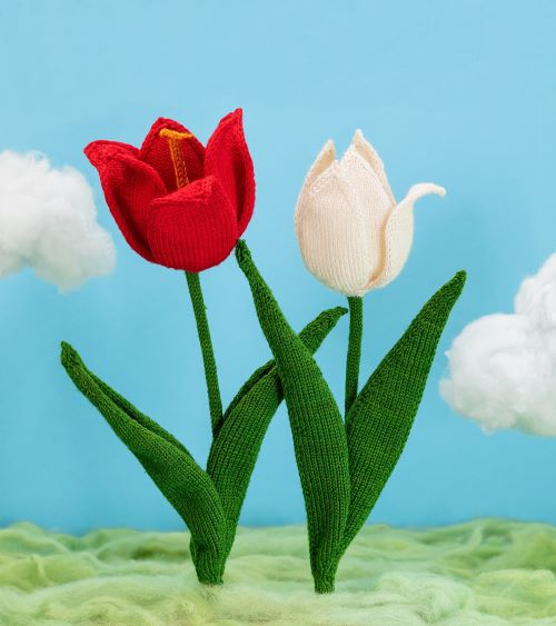 The talented team at Odd Knit designed these knitted tulip flowers, a perfect way to use your leftover yarn. You can knit it in different colors and variations, with some flowers partly open and others fully open.