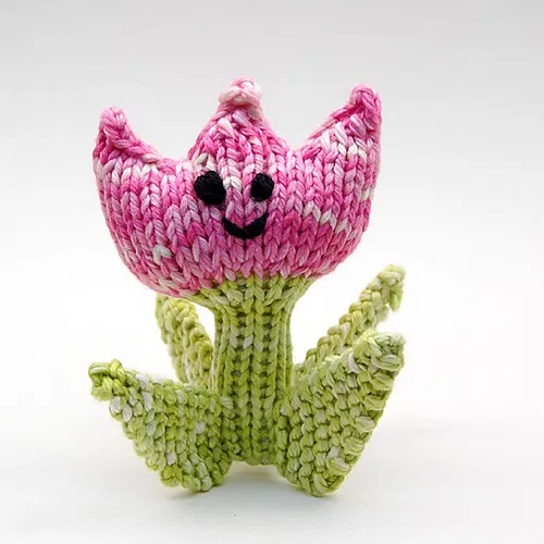 Use up your yarn scraps to create this smiling tulip, designed by Cheezombie. It is knitted mostly in the round on DPNs, and the leaves are knitted flat. You can make many of them and create your own field of blooms, and decorate your side table.