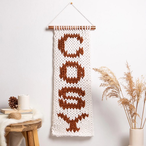 Jazz up your home with this knitted wall hanging by Sarah Murray. The design creates a warm and charming vibe in the home. You can use vibrant or neutral hues to make it feel cheerier. All you require is 3 x 4mm knitting needles and Aran yarn.