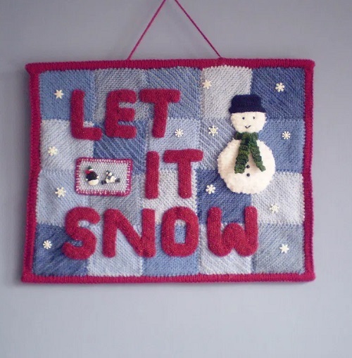 The snowman wall hanging is perfect to add a festive vibe to your Christmas party. You can display it on your door or at the entrance way. Frankie Brown is behind this sweet and cozy project. The finished design measures about 45cm wide and 36.5cm tall.