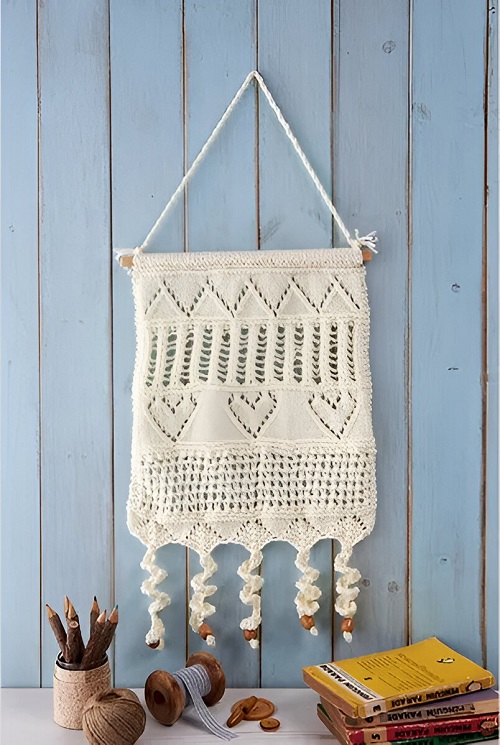 Whether you hang it in the living room, bedroom, or in a cozy reading corner, it will surely catch everyone’s attention. The textured wall hanging pattern by Yarnspirations is worked without any complex technique.