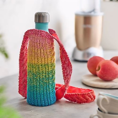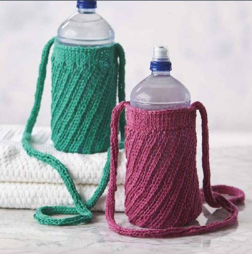 A quick and easy project by Michelle Cain can be worked with worsted-weight yarn in any color. You can keep it in your purse, small travel bag, or knitting bag and stay hydrated whenever you need.