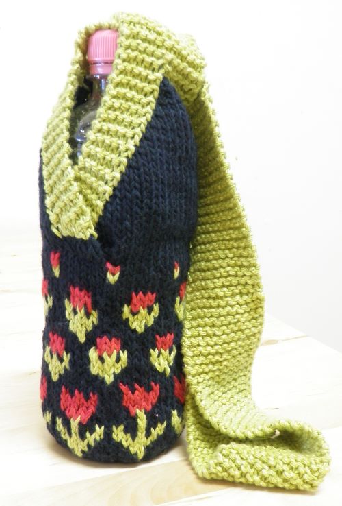 Celebrate the springtime with this tulip water bottle pattern, created by Sheila Stokes. It is worked in the round, and the tulip is worked in fairisle-style stranded knitting.