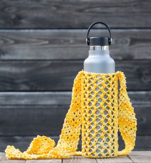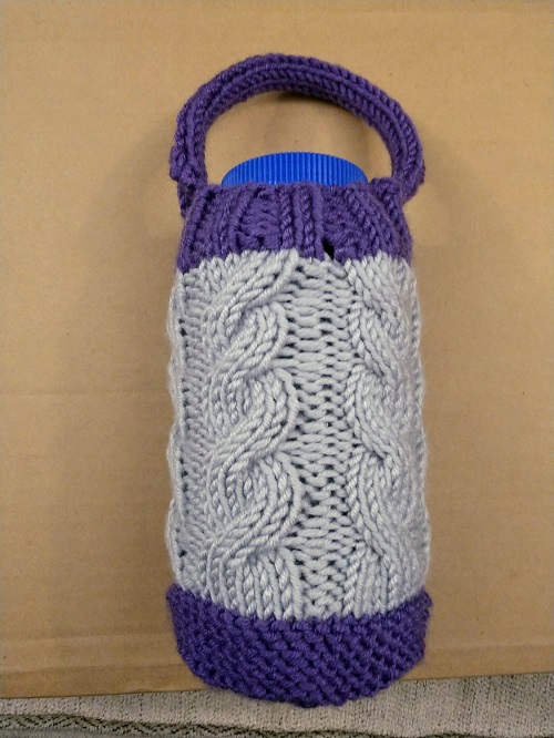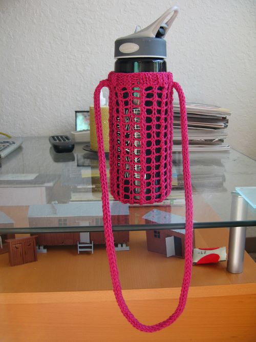 A bottle water holder with a short handle by Lisa Ebert will let you carry your bottle just like a purse. You need to have bulky yarn weight and US 10½ knitting needles.