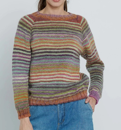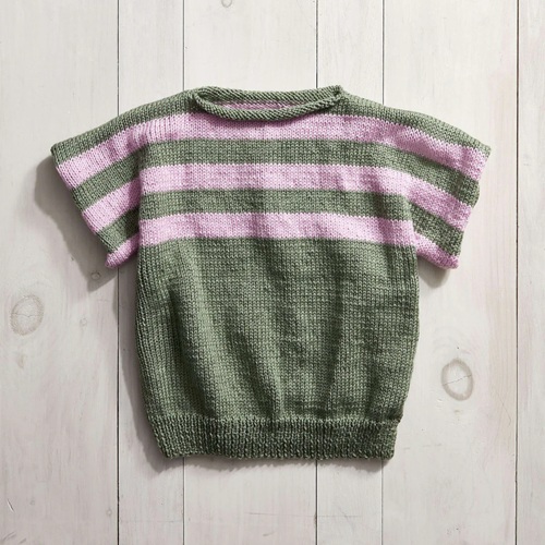 A classic sweater pattern by Yarnspirations with simple stripes and shaping in a pink and grey color combination. You can try knitting in different yarn colors.