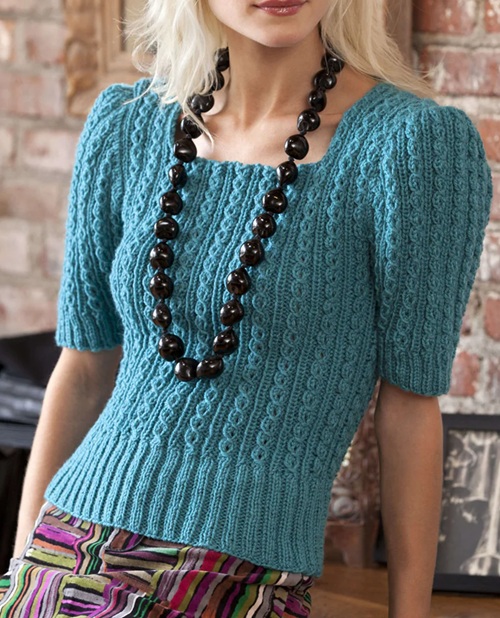 This Yarnspirations sweater fulfils the idea of combining cables and ribbed patterns. A comfy blue sweater and sleeve cap sleeves give the shoulder a bit more stature and a glam look.