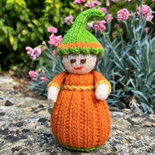This pumpkin doll pattern by Claire Fairall Designs is designed for DK (worsted weight) yarn. The head and body pumpkins are knitted flat and seamed. The shaping is easily added after you have sewn up and stuffed the head and body.