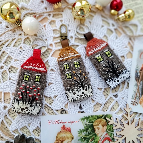 Try your hand at this cozy winter house keychain by AuntCharlieShop. It features a miniature snowy cottage with embroidered windows, a tree, snow, lace, and a keyring, which is perfect for holiday decor.